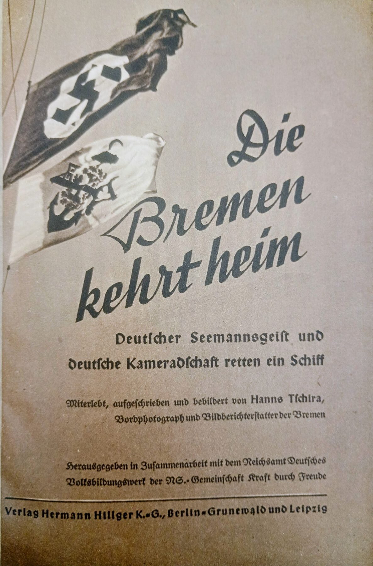 [2] Hanns Tschira, Die Bremen kehrt heim. Deutscher Seemannsgeist und deutsche Kameradschaft retten ein Schiff. Miterlebt, aufgeschrieben und bebildert von Hanns Tschira (Bordphotograph und Bildberichterstatter der „Bremen“). Herausgegeben in Zusammenarbeit mit dem Reichsamt Deutsches Fortbildungswerk der NS-Gemeinschaft Kraft durch Freude, Berlin/Leipzig 1940, S. 63.