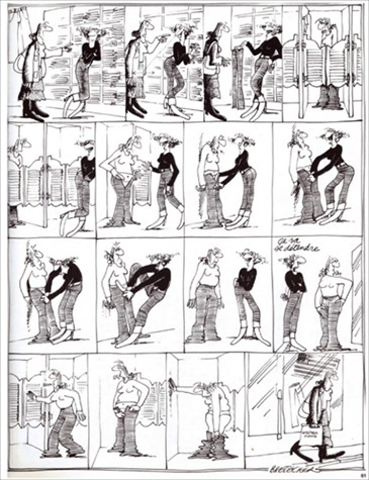 08_Size 40 Published 15. December 2025 at 369 × 480 in 08_Size 40 ← Previous Next → Fig. 8. Claire Bretécher, “Size 40 Narrow” (“Oh, it’ll give”), “Les Frustrès” 3, Edité par l’auteur, 1978, p. 61 © ©